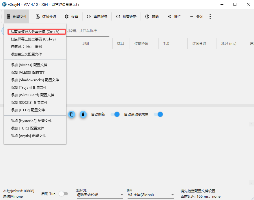 3.复制你的线路链接,进入连接软件,点击“配置文件”->“从粘贴板导入分享链接”