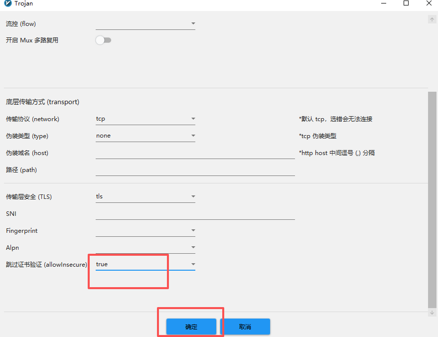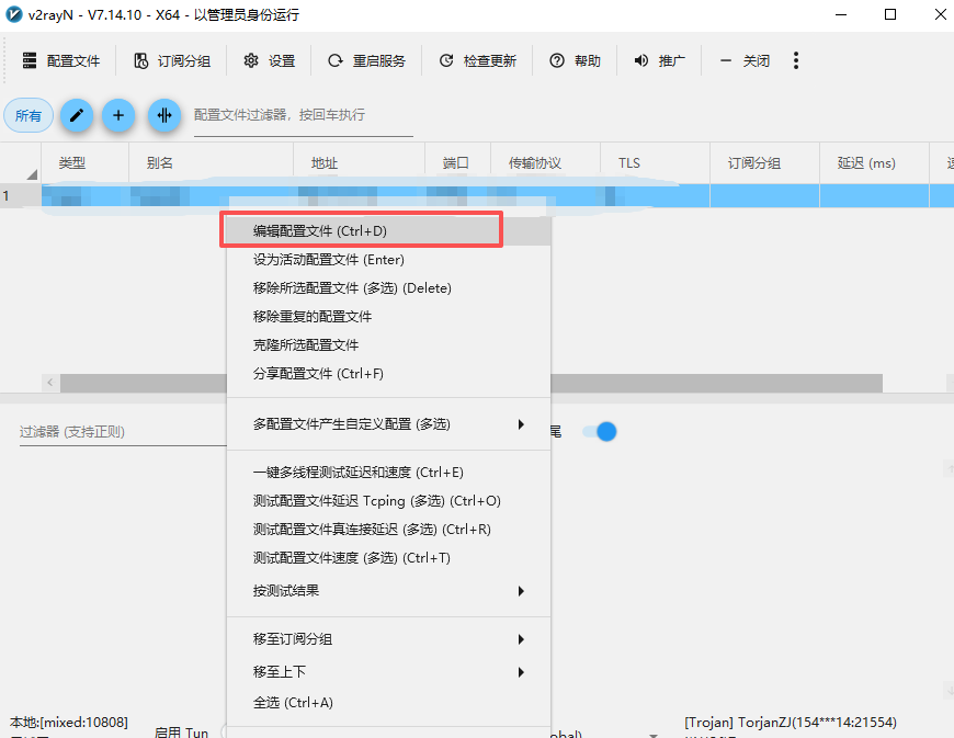 4.选择导入的线路,右键点击“编辑配置文件”,设置“跳过证书验证(allowInsecure)”为“true”,再点击“确定”,保存配置文件。