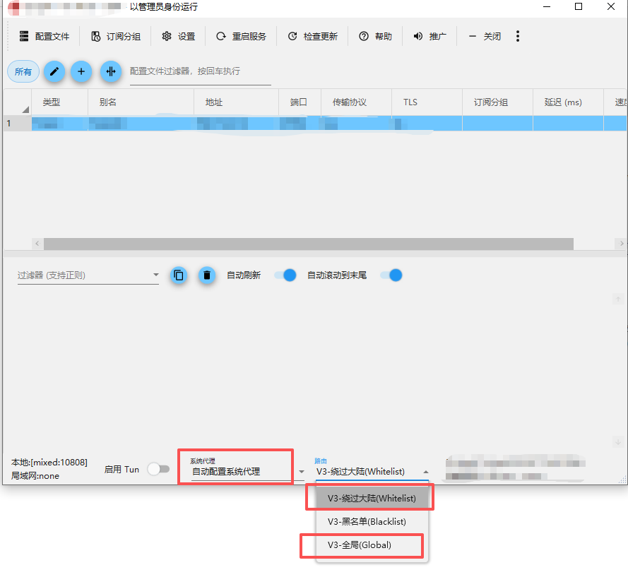 6、路由选择“绕过大陆”表示国外流量才走线路,路由选择“全局”表所有流量走线路。系统代理设置为“自动配置系统代理”后开始上网,不用时请系统代理设置为“清除系统代理”。