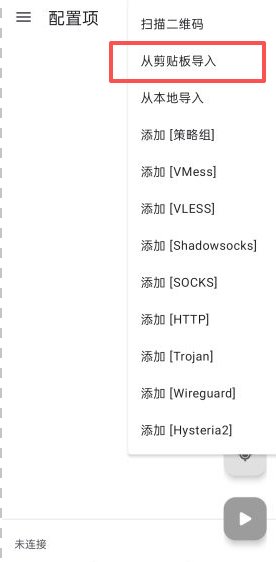 2、复制线路链接,打开安装的软件,点击右上角’+‘号,选择“从粘贴板导入”。