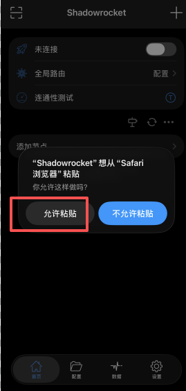 1、复制线路链接,打开小火箭Shadowrocket,自动弹出导入线路的窗口,点击“允许粘贴”,导入线路。