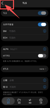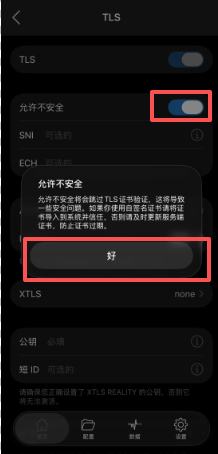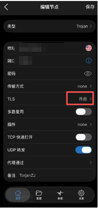 2、点击蓝色“!”,编辑线路设置,再点击“TLS”。
